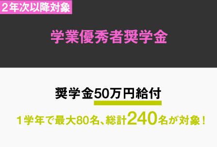上記試験種別において上限200名の成績優秀者に入学後300,000円を支給します。