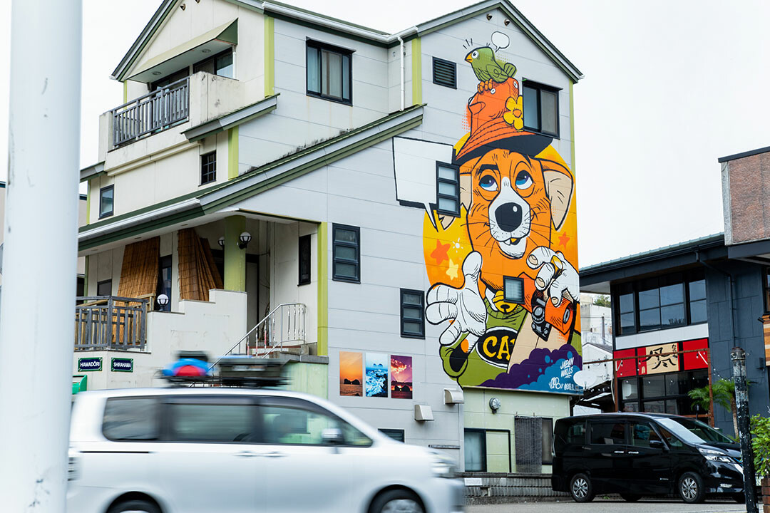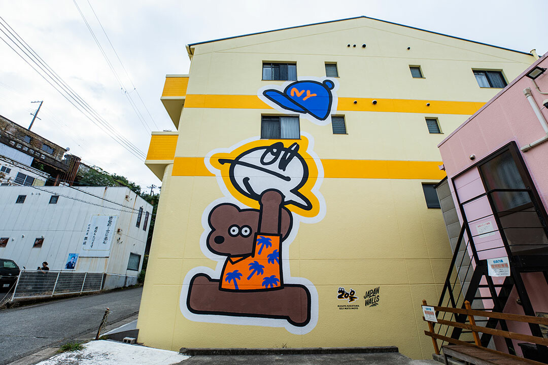 松本セイジさんと中山誠弥さんのユニット「20号」が制作したのは白浜の柳橋通りから少し山側に入ったところにある集合住宅の大きな壁面。そこに、ねずみのANDYとPonZが一緒に遊んでいるように描かれています。白浜らしいモチーフとして日焼けしたANDYはオレンジのアロハを着て、PonZはNYメッツのカラーリングのキャップをかぶっています。