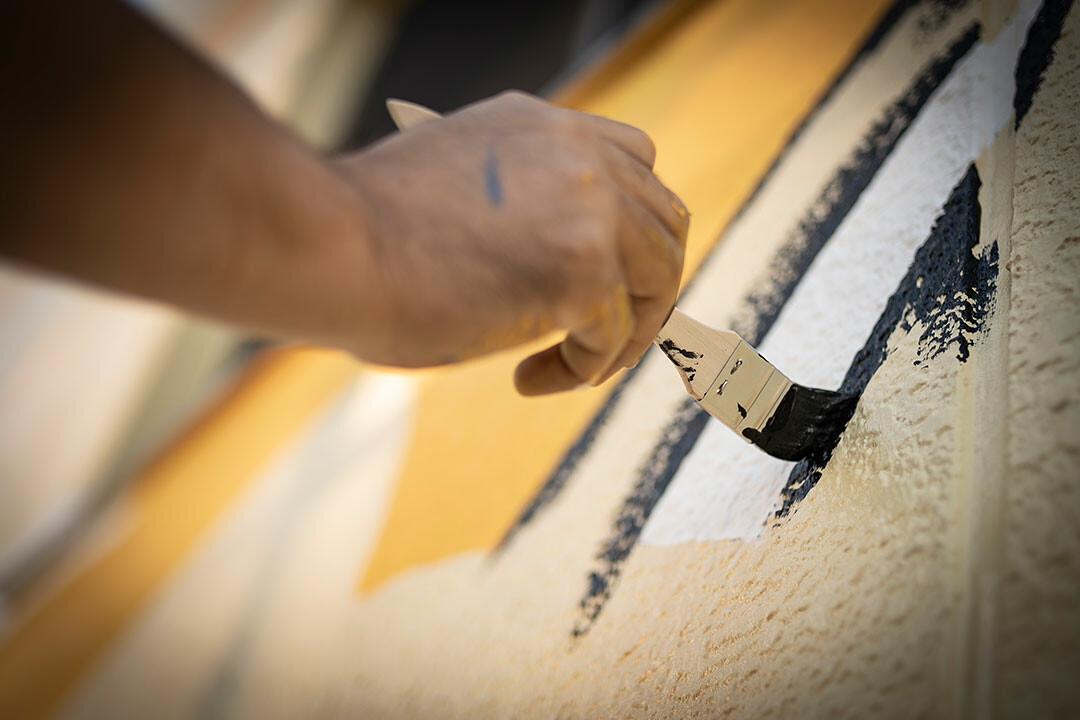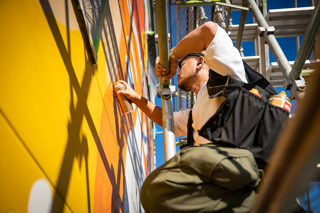 制作をしていると近くに住んでいる人たちが、足場に登って描いている2人を何が出来上がるんだろうと見上げていきます。こうやって「ふだん美術館やギャラリーに足を運ばない人に自分たちの作品を見てもらえるのも壁画制作のやりがいのひとつですね」と松本さん。