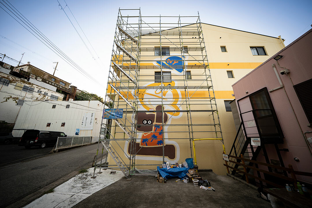 そこから徒歩数分の場所で制作していたCABさんも大阪美術専門学校の卒業生です。CABさんが描くのはコミカルで独特な表情を浮かべた独特なキャラクター。「今回の現場は海にそった大通りなので、青空に映える色使いにしました」とのこと。