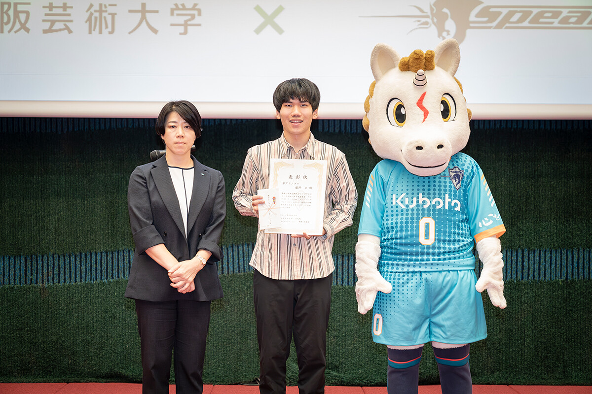 ゼネラルマネージャーの中野さんが「ファンとの一体感を高め、士気を向上させるために大阪芸術大学との連携を決めました。どの作品も素晴らしく、選考は非常に難航しました。このチームソングを胸に、チーム一丸となってリーグ優勝をめざします」と挨拶。その後、準グランプリの大塚理功さん、藤野圭さん、グランプリの「6ix Soldier」メンバーが登壇し、表彰状と副賞が授与されました。