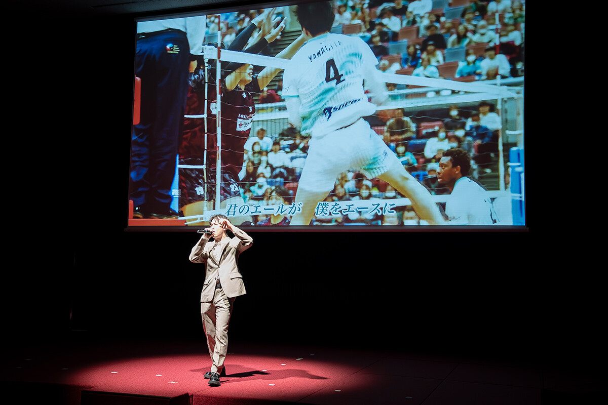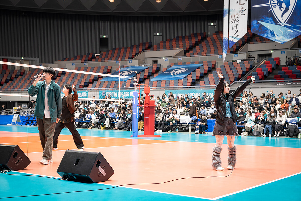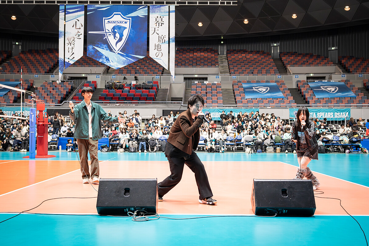 12月7日には、大阪市港区のAsueアリーナ大阪(大阪市中央体育館)で行われたVリーグ公式戦のハーフタイムに、ファンに向けたお披露目イベントが行われました。第2セット終了後、コート上に「6ix Soldier」の戸高匠大さん、久保守充さん、志田百穂さんが登場。1000名を超える観客にぐるりと囲まれた特別なステージで、公式ソング「Color Your Future!~繋がる想い~」を熱唱しました。
