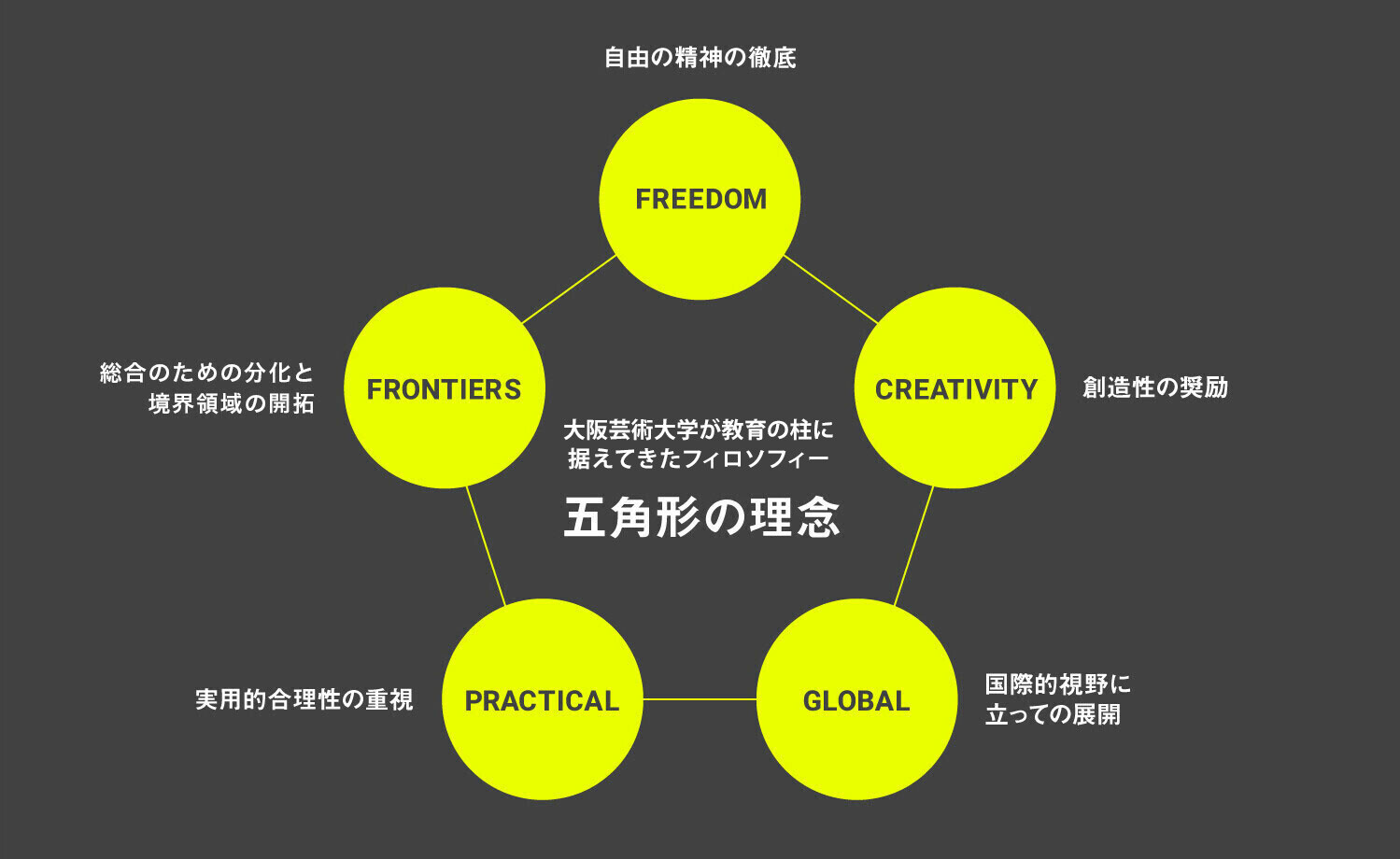 本大学芸術学部は芸術における狭義の創造性にとどまらず、科学技術・産業・交通・通信・政治・行政その他社会活動全般にわたり創造性を奨励したい。