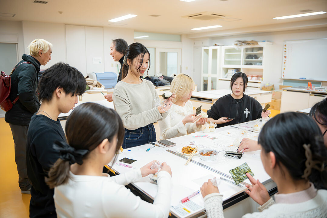2021年には、デザインプロデュース、グラフィックデザインなどコースの異なる3年生から1年生までの学生が集まって「万博とその先の未来のために」再スタートを切ります。そこでは学生同士が互いに刺激しあい155種ものアイデアを生み出しました。そのなかから生まれたのが「世界のおにぎり」プロジェクト。
