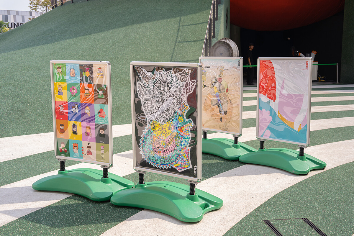 また、授業で制作された作品だけでなく、学科や学年を問わず公募も行われ、最終的に、その中から展示される作品が選抜されました。会場では、在校生22人、デザイナー・前田高志氏、アーティスト・石塚大介氏ら活躍中の卒業生に加え、くっきー氏(野性爆弾)、酒井藍氏、中野周平氏(蛙亭)など吉本興業の芸人12名など、40点の作品が展示されました。