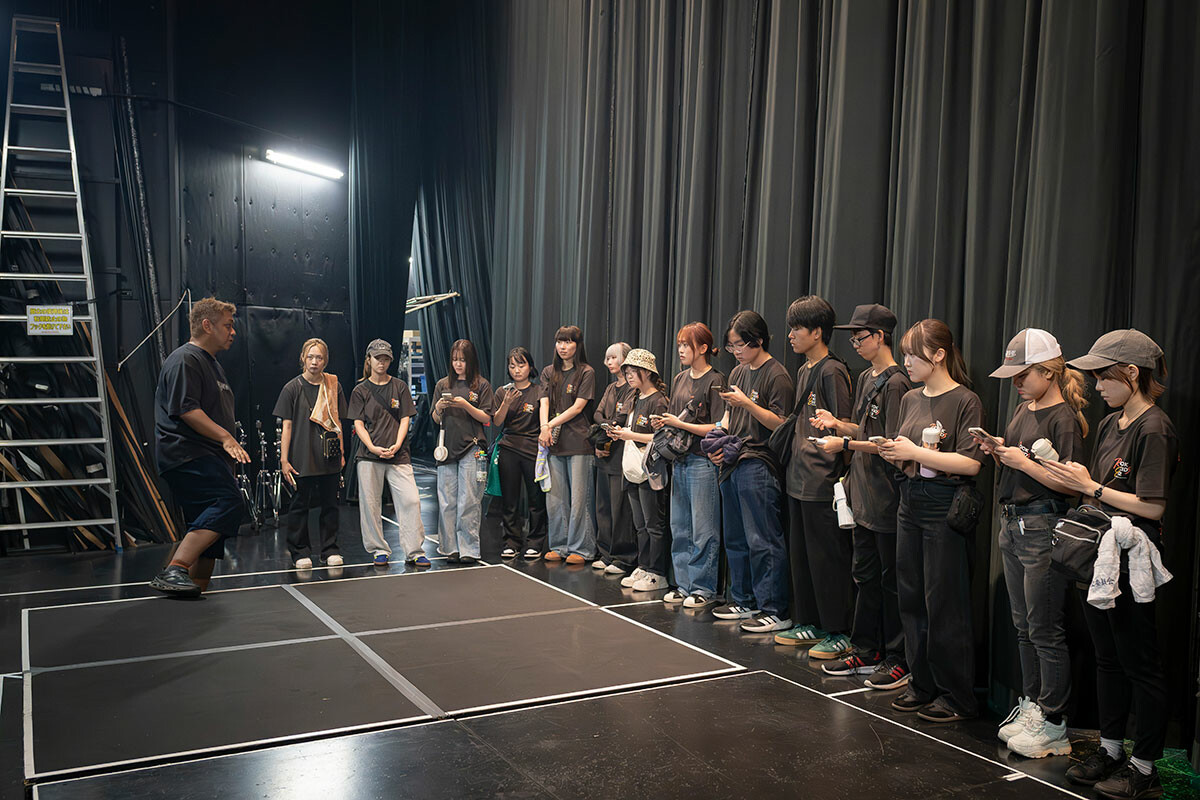 会場入りした芸術計画学科の学生たちはまず、FM802の番組プロデューサーで同学科客員教授の今江元紀先生の指導のもと、設営スタッフのみなさんがステージセットを組む様子などを見学。今江先生は、舞台監督などの紹介や、どのようにすればスムーズに楽器の準備やセットチェンジができるかなどを説明。ミュージシャンのベストパフォーマンスを引き出すために必要なことを学生たちに伝えました。