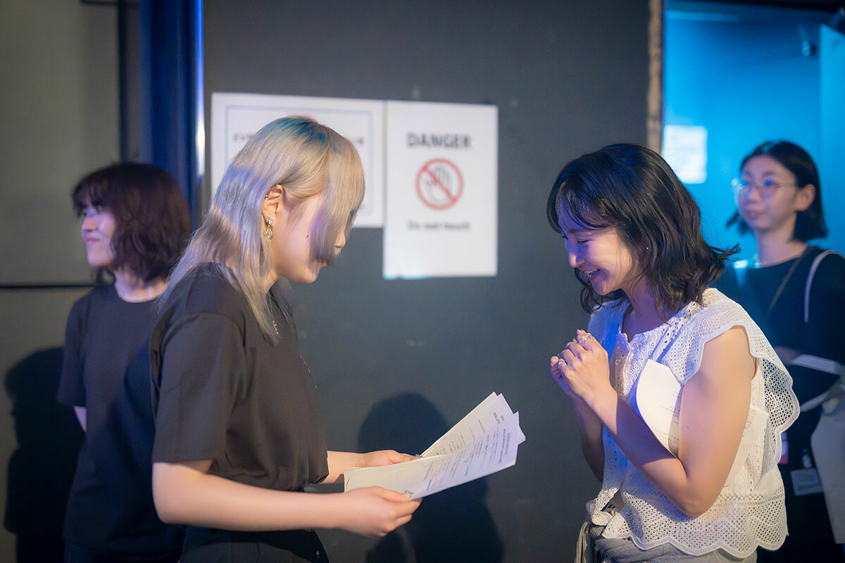 1回目の影ナレでは場の雰囲気もつかみきれず、原稿を読み間違えたとき「あ、どうしよう」と焦りが出てしまうところもありました。でも2回目に臨む前、板東さえかさんから「読み間違えたとしても、自分の心を落ち着かせて読み直したらいいよ」とアドバイスをいただいたんです。また、落ち着いて読むべき箇所には「ゆっくり」「待つ」などと原稿にも書いておきました。単調に読まないように意識もしました。事前に学内で実習発表会があって朗読をおこなったのですが、そこで感情を込めて文を読むことについて学んだので、その経験が今回の影ナレにも生かすこともできました。もちろん、お客様の中には「実力不足だな」と感じる方もいらっしゃったはず。自分自身もその自覚はあります。ただ、その中でも拍手をいただけたことは大きな自信になりました。私は将来、ラジオDJになりたいと思っています。リスナーの気持ちに寄り添ったり、自分の人柄を出したりしながら音楽を紹介することで、その曲がもっと魅力的に聞こえることがあります。私も「この人がDJを担当しているから、その番組が聞きたい」と言われるDJになることをめざして、大学でいろんなことを学んでいきたいです。