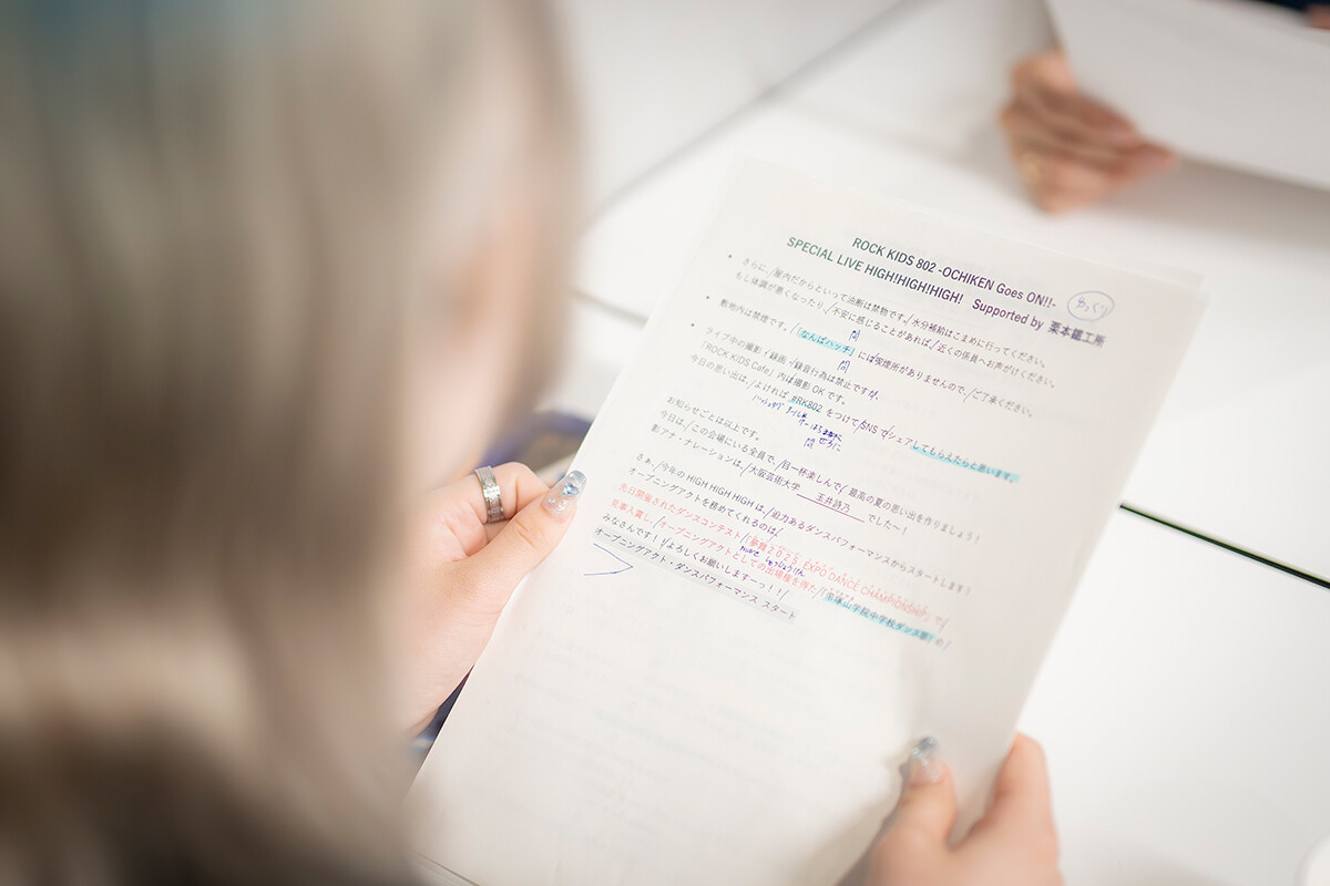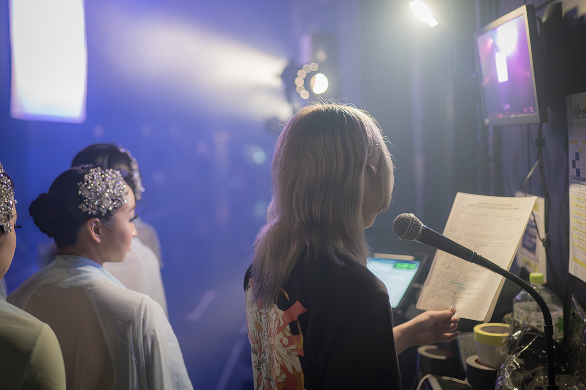 芸術計画学科の学生たちが会場のあちこちで奮闘している中、楽屋フロアの一角で台本とにらめっこしていたのが放送学科の玉井詩乃さんです。玉井さんは、FM802の局内を利用した放送学科学生対象のオーディションで合格し、大役に選ばれました。ちなみに影ナレーションとは、開演前に舞台袖でイベントの紹介や注意事項をアナウンスする仕事です。この日は、開演20分前と開演直前の2回、影ナレをおこないます。開演20分前の1回目の影ナレでは、気持ちのたかぶりを抑えられなかったのか、少し急ぎ気味に喋ってしまいました。