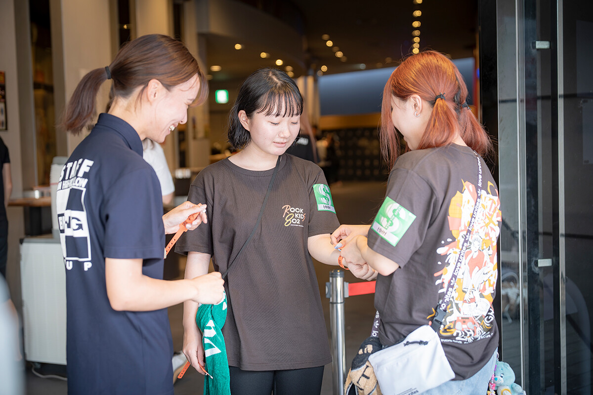 来場者の手首にリストバンドを巻く学生