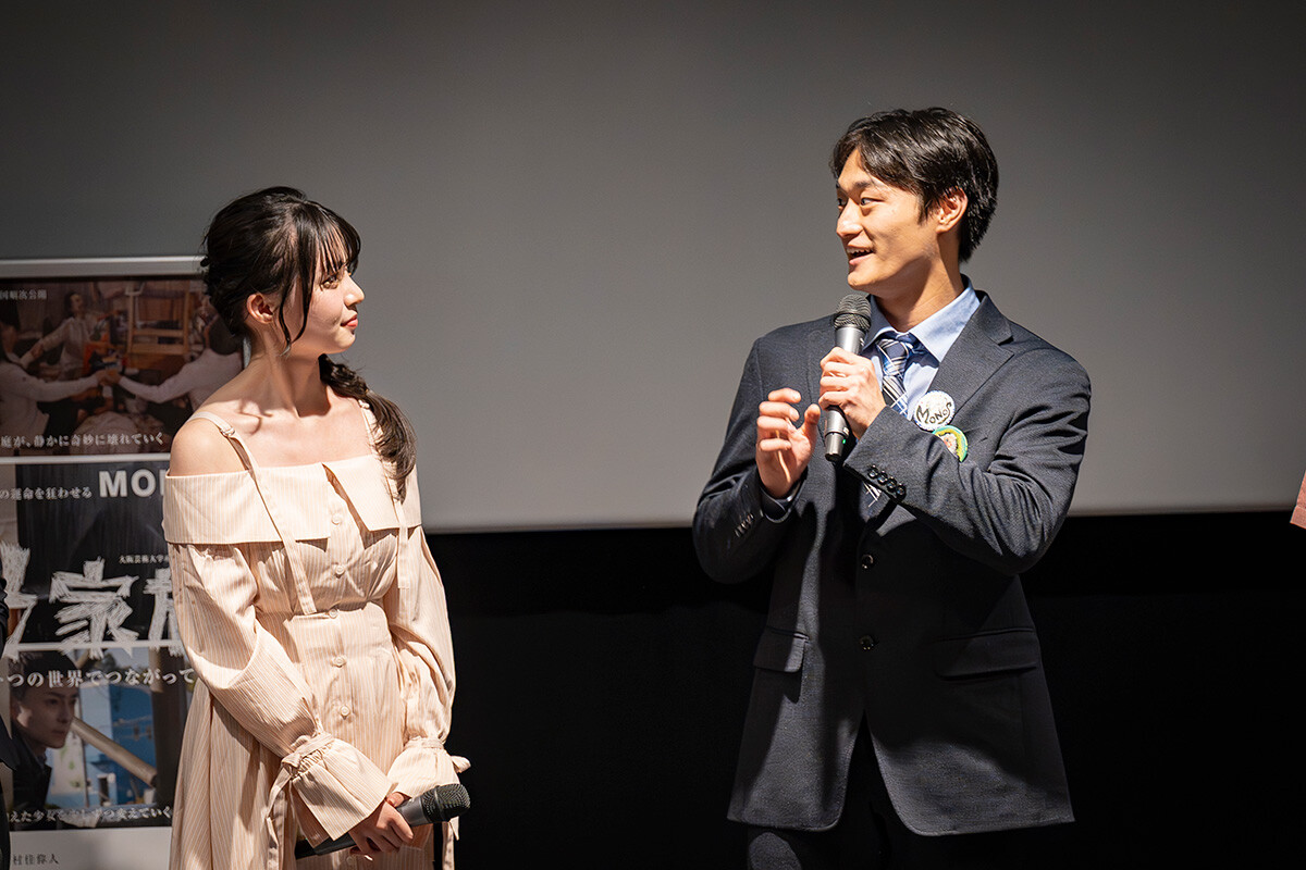 三篇すべてに出演している三浦さんは、「(三篇いずれも)不思議なストーリーだなって。撮影していきながら『こういう物語なんだ』と分かっていきました。「MONOS」はものすごくパンチが効いていて、(演じていて)わくわくしました」と振り返ると、「MONOS」で三浦さんの恋人を演じた秋庭さんは「芸大らしい脚本だなって思いました。僕が演じた恵一はコミカルで、僕と似ていないところがほとんどありません。大好きな役です」と語りました。
