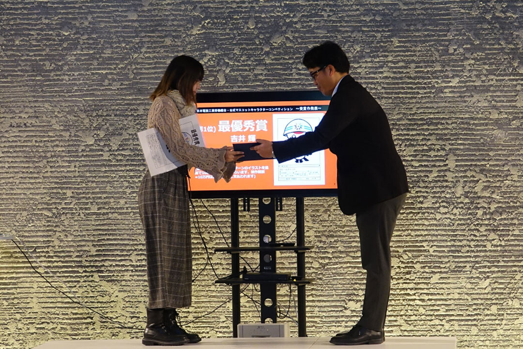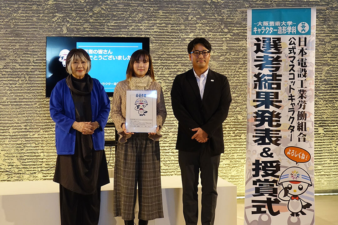開催にあたっては、キャラクター造形学科教授の有馬啓太郎先生が、学生への説明、作品募集などさまざまな調整をしてくださり、学生からは総数92作品の応募がありました。応募作品は日本電設工業労働組合の組合員投票で厳正なる審査の結果、最優秀賞にはキャラクター造形学科ゲームコース3年生 吉井輝さんの作品が公式マスコットキャラクターに選ばれました。
