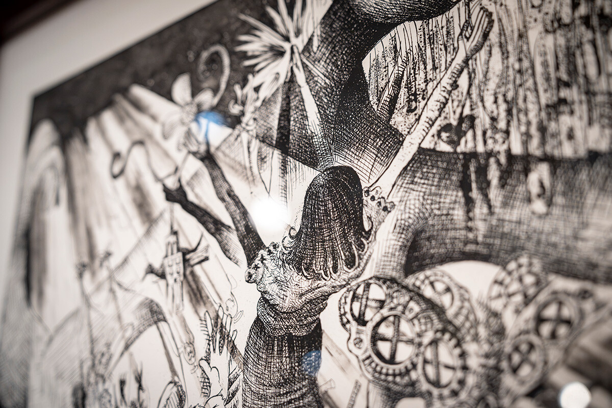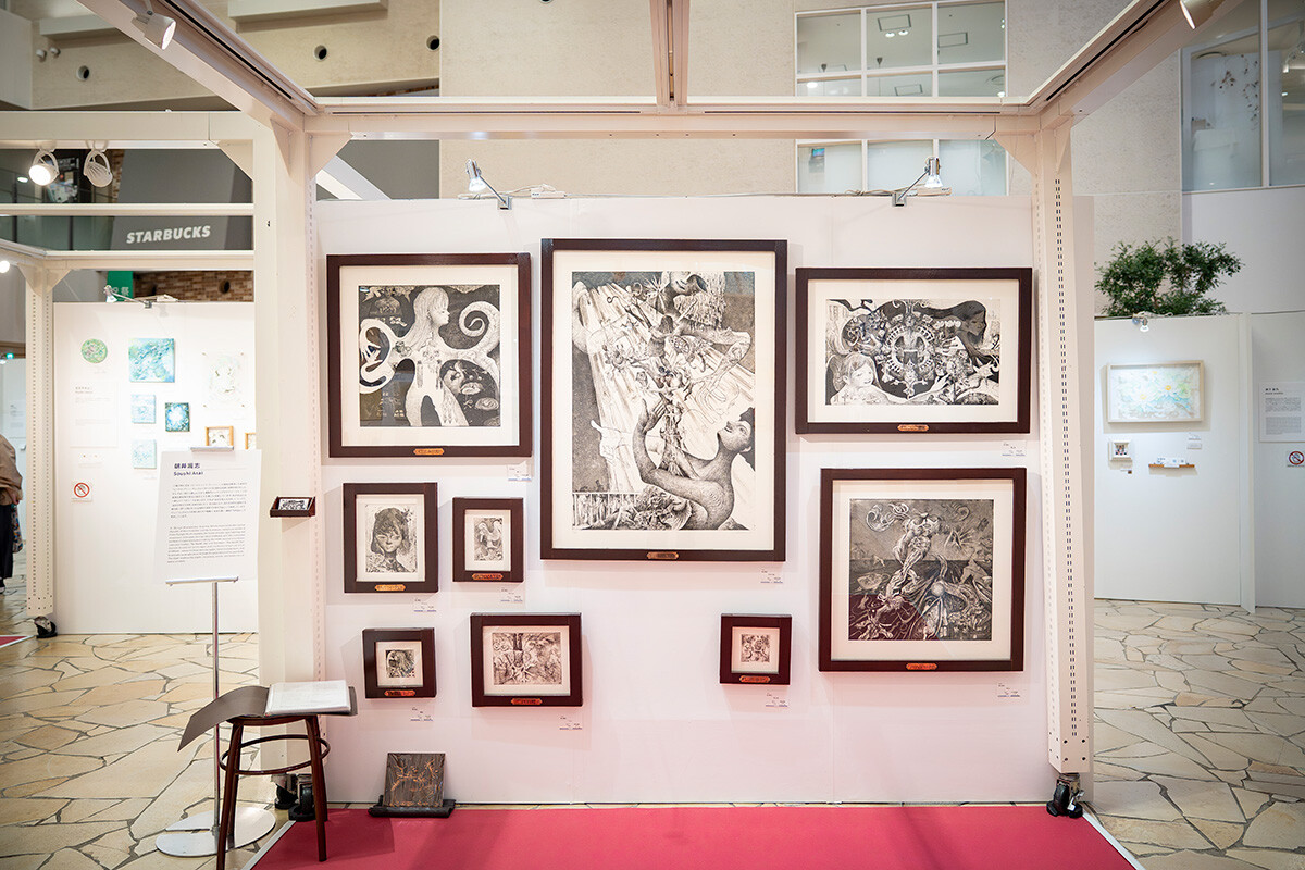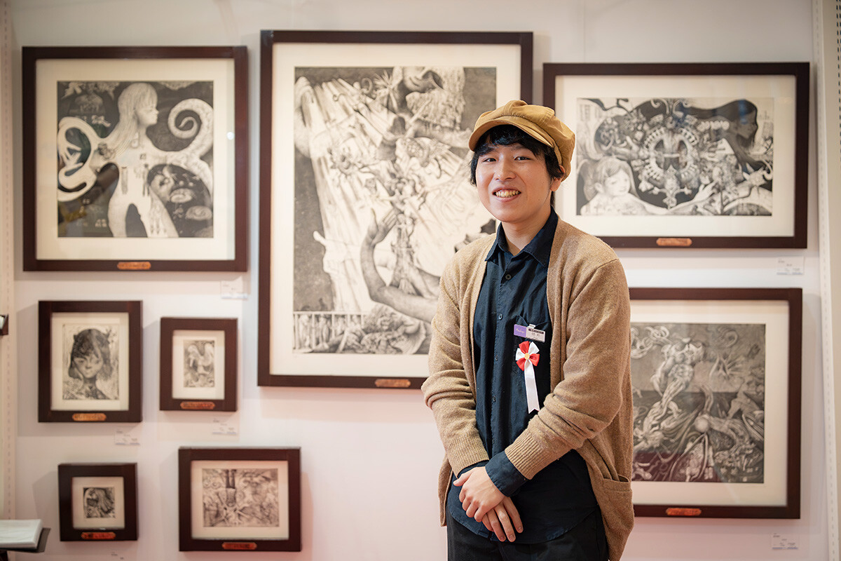 百貨店での初めての展示、しかも今回の出展作家の中で最年少という立場で緊張しましたが、多くのお客様と直接お話できて嬉しかったです。熱心に鑑賞してくださる方や、何度も足を運んでくださる方など、関心の高さを肌で感じました。今回出展した作品は、大阪・関西万博で目にした人工心臓などの先端医療技術から着想し、「生と死」についての思いを表現したもの。白と黒のみの銅版画に対して、これまでは「力強い」「不思議」などの感想が多かったのですが、今回は「あたたかい」「優しい」といった声もいただき、意外さとともに新しい可能性を感じました。