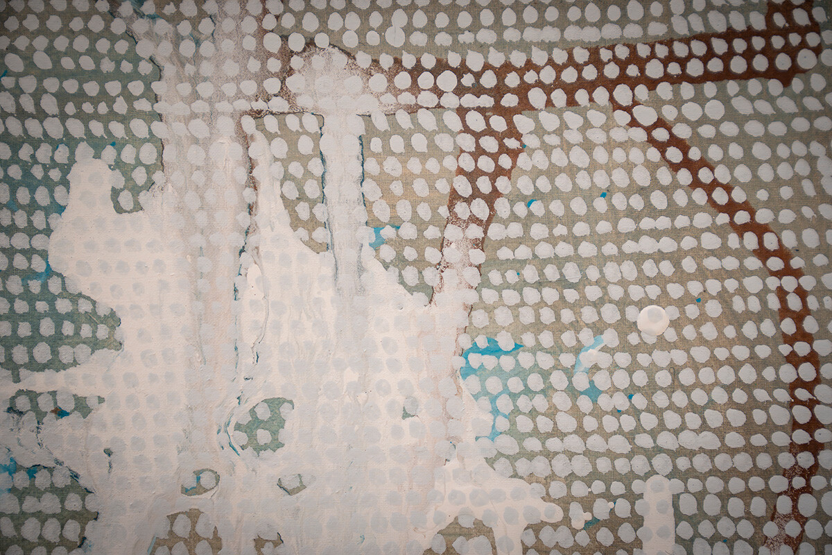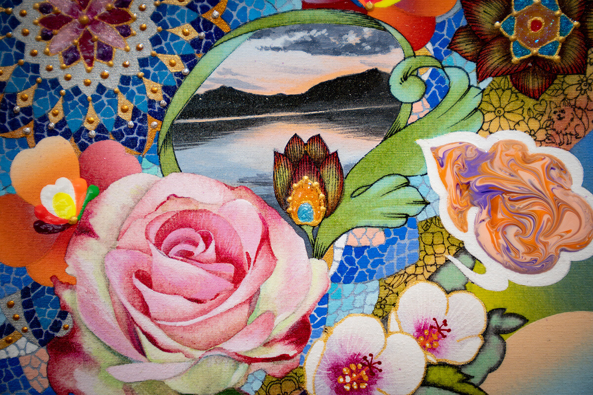 美術学科出身のAiko Kunoさん、朝井颯志さん、岡本博紀さん、笠原彰人さん、﨑新谷萌夏さん、ハッピーモンスター横岑竜之さんの展示は、まさに表現の多様性を体感できるラインナップ。鮮やかな色彩に木炭などでドローイングのニュアンスを添えた絵画、幻想的な世界に誘われる緻密な銅版画、伝統的な文様で「風景と記憶」を描いたペン画、様々な花など数多くのモチーフが絶妙に調和する作品、無数の点がヴェールのように画面を覆う抽象画、強烈なオリジナルキャラクター作品など、それぞれの探求の成果が息づいていました。