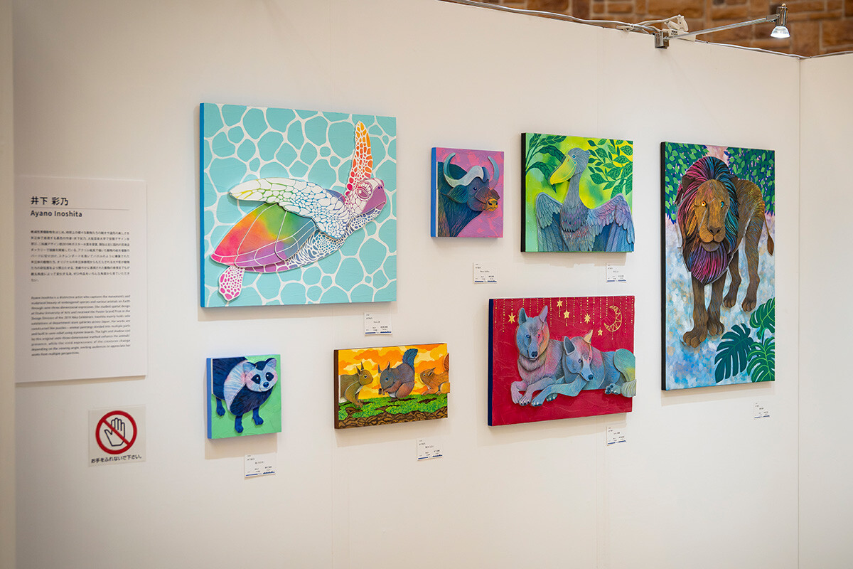 また、井下彩乃さん、イユダエマさん、ピトさん、MINAMI MIYAJIMAさんはデザイン学科、山田紗世さんは大阪芸術大学短期大学部デザイン美術学科出身。動物の半立体アート、可愛いポップな作風の中にダークさがひそむ作品、ラメやアクリル絵の具でリズミカルに描いたカラフルなアート、四角形が密集する幾何学的なモノトーン作品、手彩色を加えたシルクスクリーンなど、多彩な技法が会場に華やぎを添えていました。