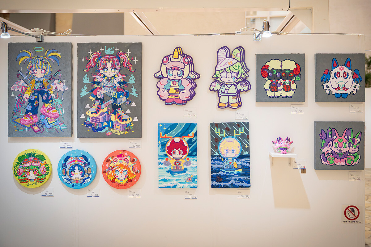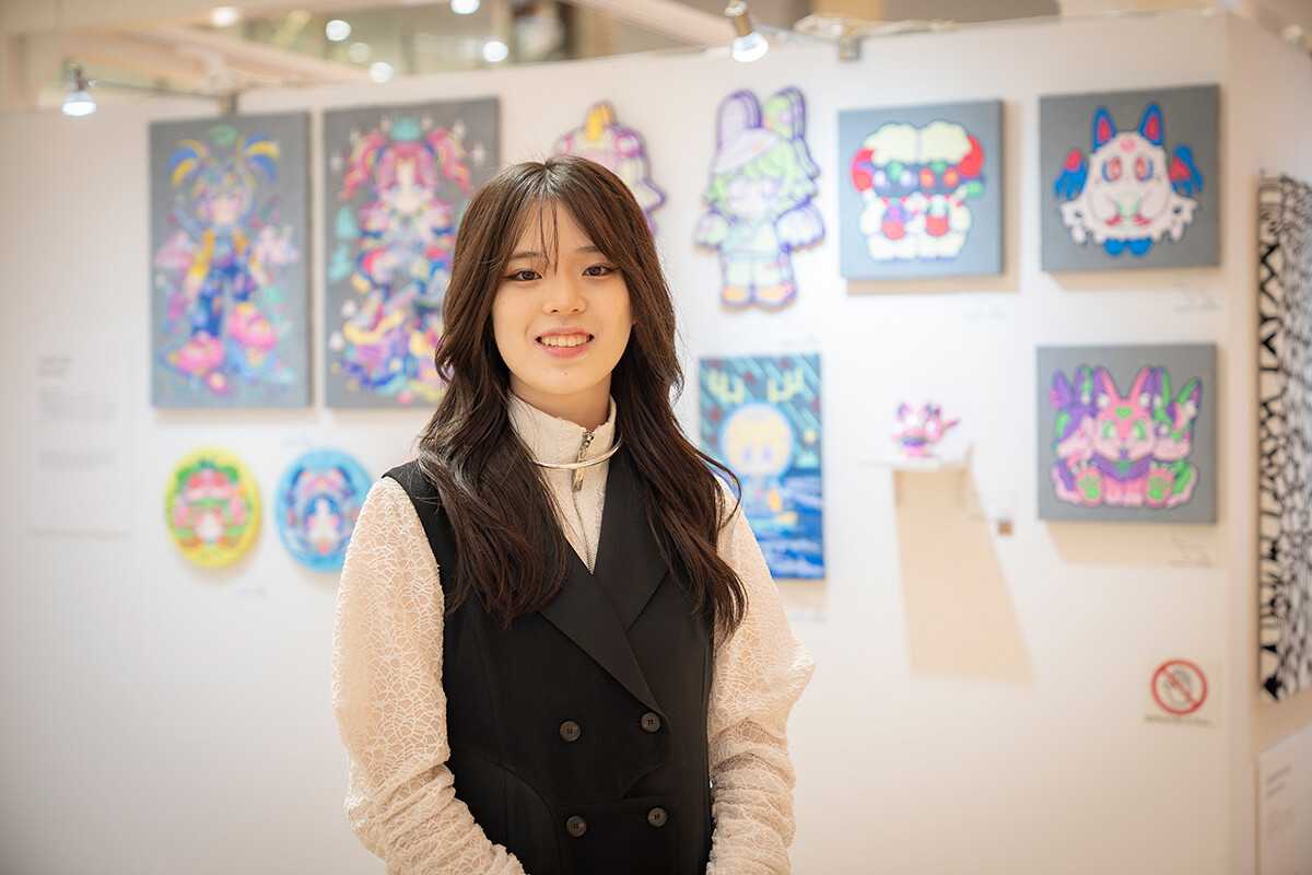 今回の出展で「いつか百貨店で展示したい」という夢が叶いました。私自身もよく訪れるうめだ阪急で作品を発表できて、本当に感慨深いです。私の作品は、ネガティブな感情をテーマにしながらも、見る人が明るい気持ちになれるようなポップな色彩を追求しており、今回は女の子やモンスターをモチーフに、平面作品と立体作品を展示しました。立体作品には3Dプリンターを活用。技術的な調整が難しく、何度も失敗しながら試行錯誤して制作したものです。絵はシンプルな線と色で構成していますが、外壁のようなテクスチャーの下地を塗り、デジタル表現とは異なる質感や存在感を表現するなど、一点もの作品としての付加価値を高める工夫も取り入れました。