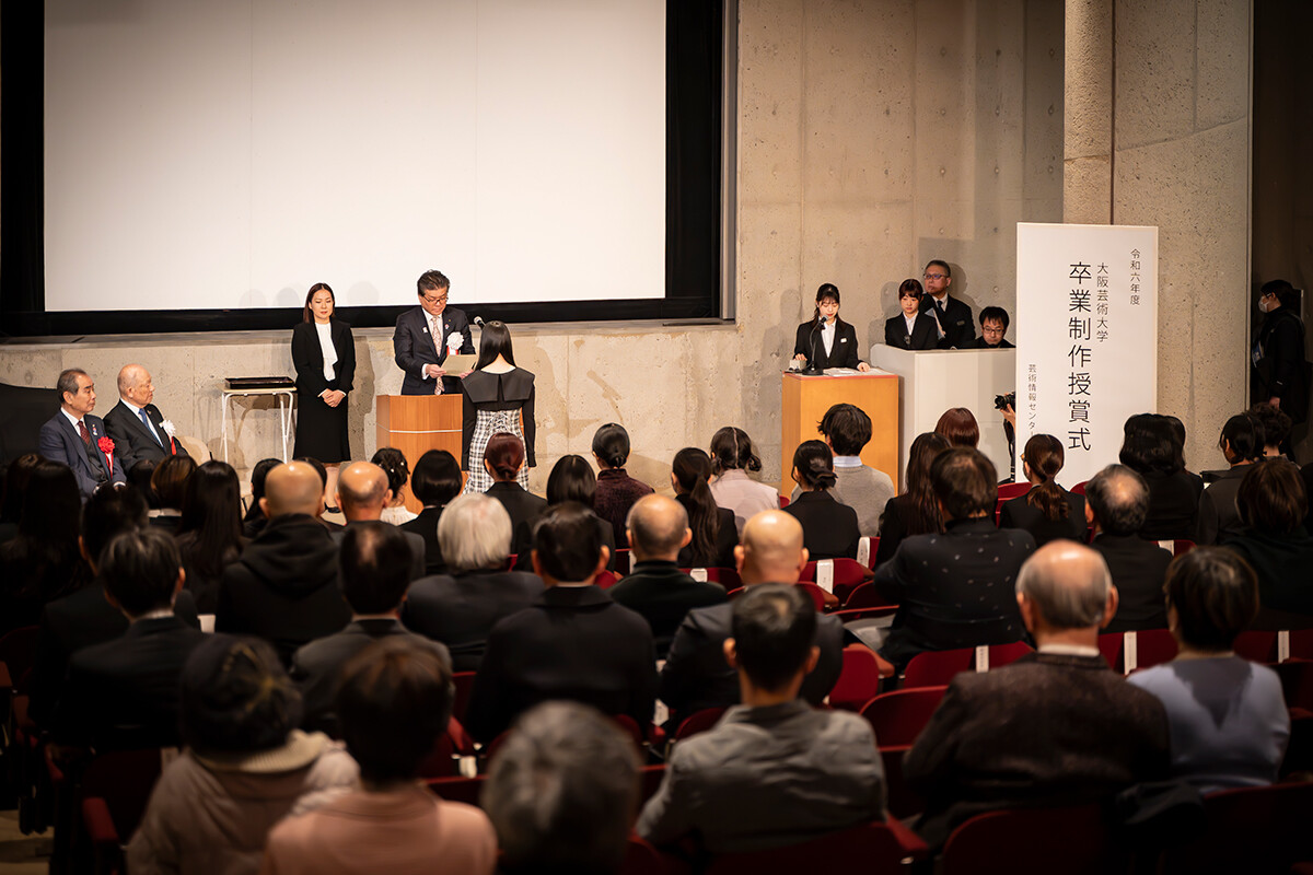 2月9日の初日は、芸術情報センター地下1階のAVホールにて学長賞や学科賞に選ばれた作品の授賞式が執り行われ、塚本英邦副学長から学生へ賞状が授与されました。