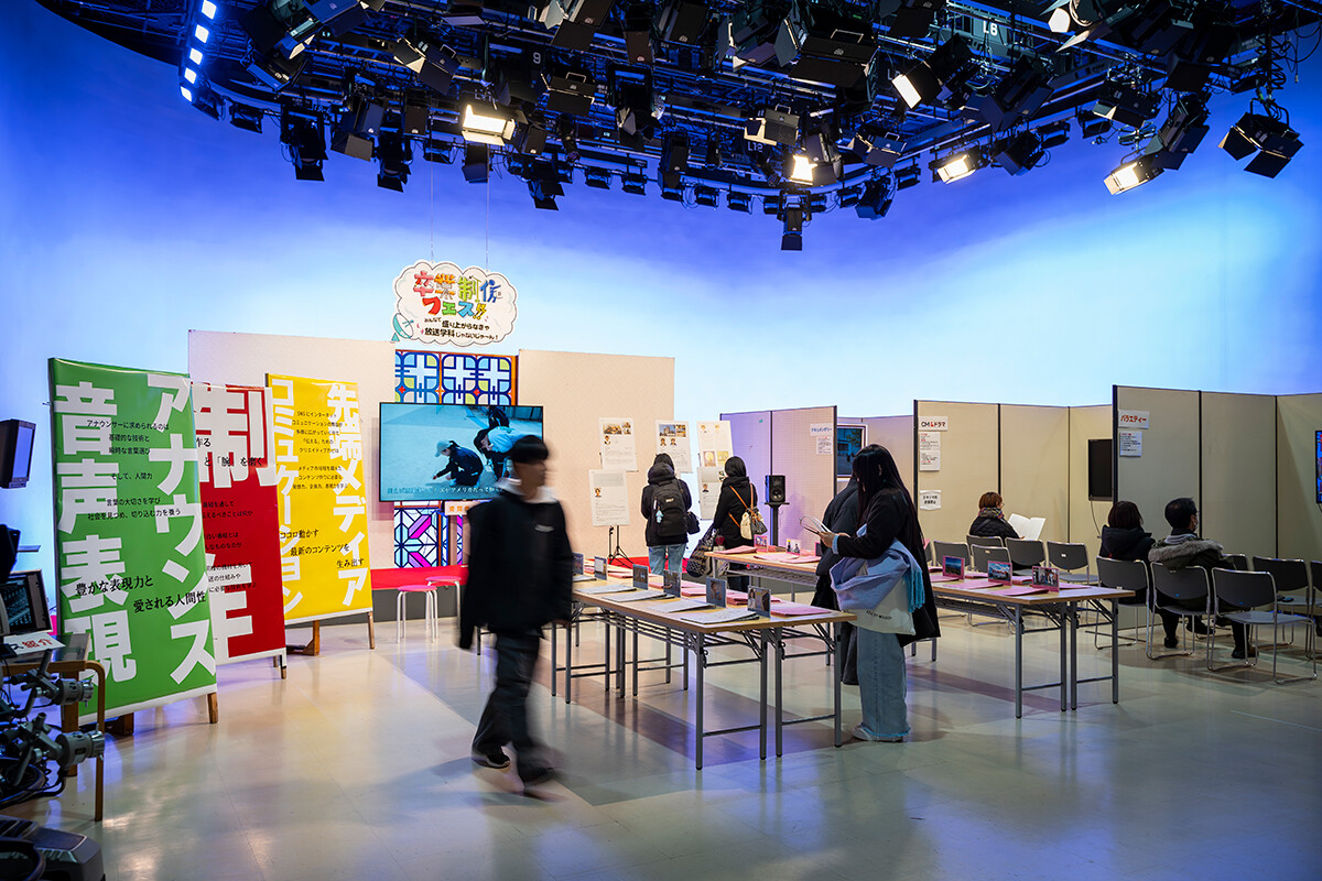 芸術計画学科は多目的スタジオで論文展示と研究発表の映像を展示。
