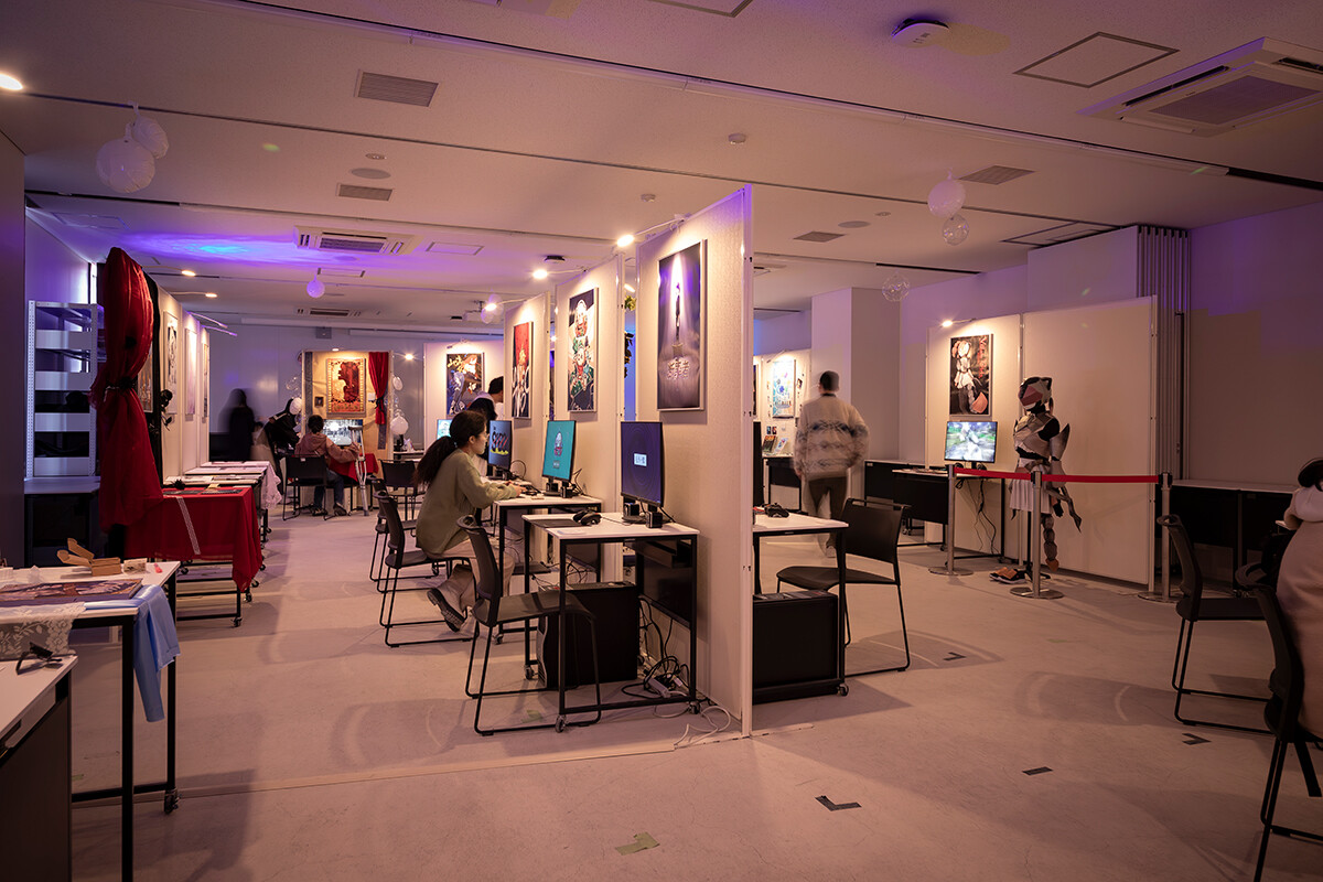 キャラクター造形学科 ゲームコースの展示風景。試遊コーナーとキャラ設定の資料を展示。