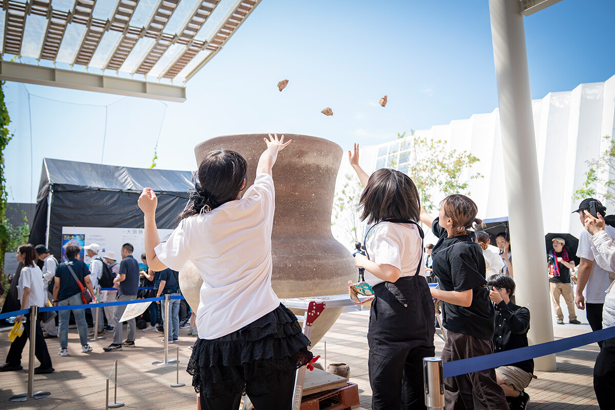 9月16日の『南河内 LIVE ART EXPO』は、大阪・南河内の6市町村がそれぞれアート作品を出品・展示する取り組み。「歴史の町」の河南町は大阪芸大とコラボレーション。2024年に河南町・大阪府立近つ飛鳥博物館で開かれた展覧会『応答する遺物 ―土器は忘却に逆らう―』にて、山村先生の手で公開制作された2メートルを超える「時ノ壺 令和大壺」を展示。さらにこの壺を用いて古代と未来を繋ぐという万博ならではのワークショップを学生たちが企画しました。